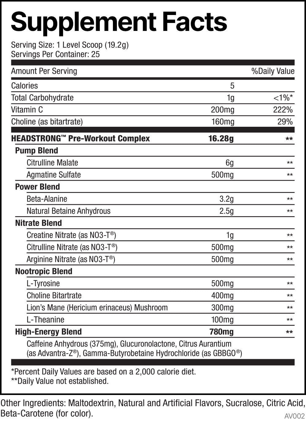 Headstrong's cutting-edge combination of powerhouse ingredients has everything you crave from a pre-workout supplement: pump, power, focus, and of course, energy for days! Your workouts will never be the same! Think you can handle it? Don’t think! Just do. Pick up a bottle of Headstrong today and get ready to have your mind blown and your body wrecked like never before during your next workout session.