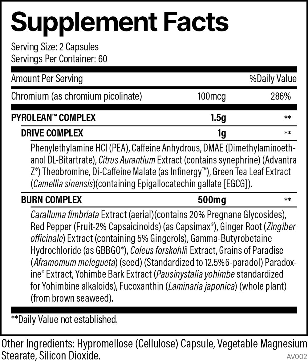 This powerful thermogenic formula is designed to support increased calorie burning, help curb occasional cravings, and keep your mind and body firing on all cylinders throughout the day. Whether you're in the middle of a cut, pushing hard in the gym, or just looking to stay sharp and active, PYROLEAN helps support a strong metabolism and relentless motivation.